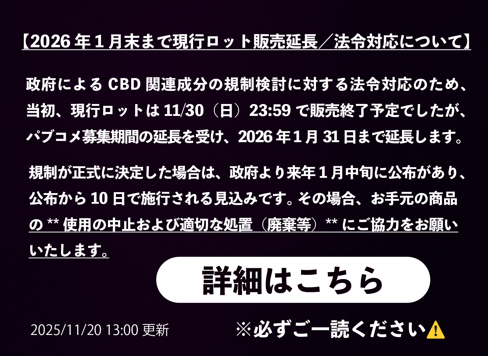 当社では、自主的に規制確定前(施行前)の2026年1月31日に現行ロットの販売・出荷・広告を予め停止します。